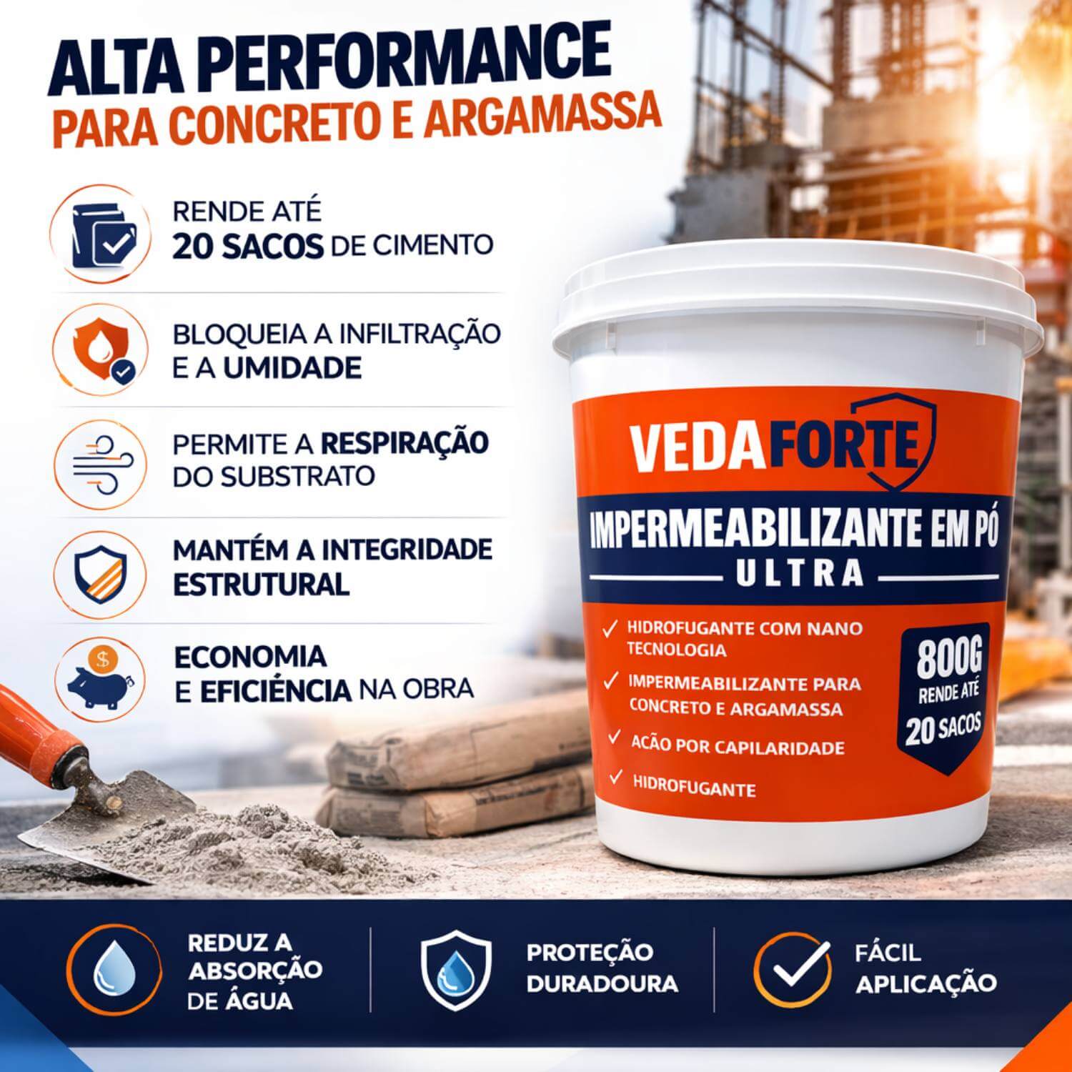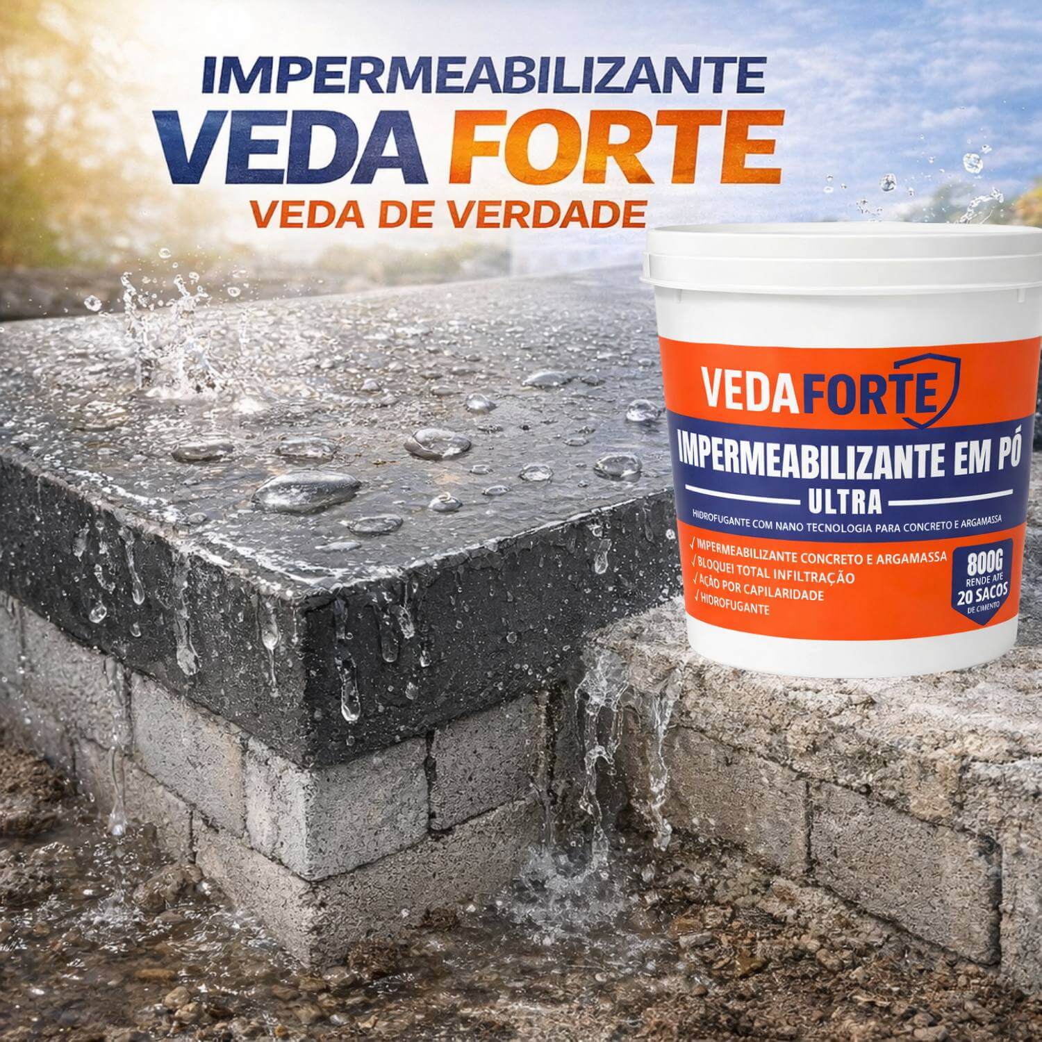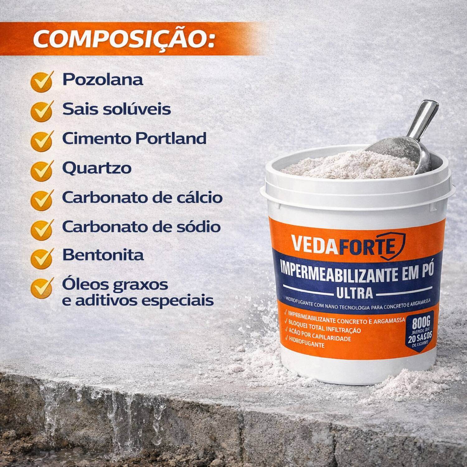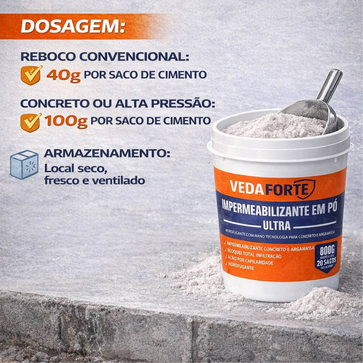 O impermeabilizante em pó ultra é um aditivo mineral de alta performance desenvolvido com nanotecnologia para proteção eficiente de concreto e argamassa. Sua ação hidrofugante atua diretamente no sistema capilar dos materiais, bloqueando a infiltração e impedindo a subida da umidade por capilaridade. Com excelente rendimento, o produto pode atender até 20 sacos de cimento, proporcionando economia e eficiência na obra. Sua fórmula permite a respiração do substrato, mantendo a integridade estrutural ao mesmo tempo em que reduz significativamente a absorção de água. Resistente à pressão hidrostática positiva e negativa, é indicado para diversas aplicações como rebocos, fundações, estruturas enterradas, piscinas, lajes e pisos. Além disso, não é tóxico e oferece segurança durante o uso.